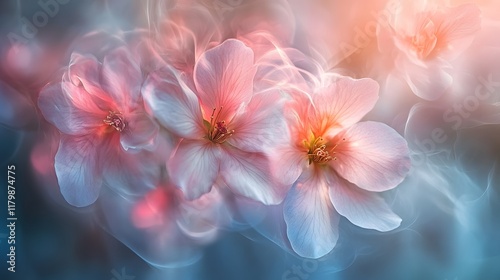 Ethereal and Vibrant Blooming Flowers Captured in Soft Pastel Hues with a Dreamy Bokeh Background Blending Shimmering Radiance and Harmonious Floral Forms