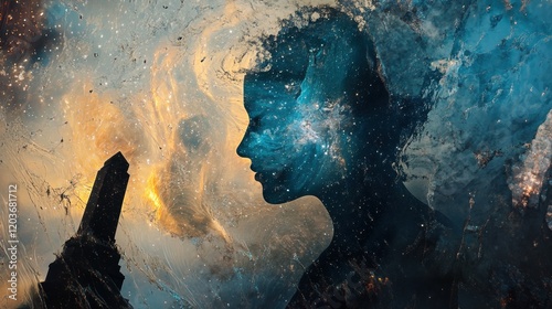 Ethereal Cosmic Woman Silhouette with Abstract Universe Background and Dark Obelisk.