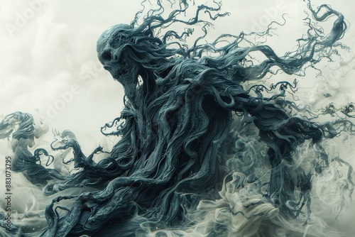 Ethereal dark spirit emerging from mist with eerie tendrils extending outward in a haunting, surreal scene.