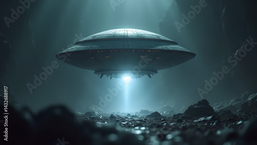 Ethereal encounter, a futuristic alien spaceship hovers over a rocky landscape