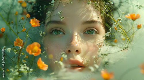woman, submerged, flower, water, beauty, tranquil, harmony, nature, bloom, face, serene, floral, young, aethereal, peace, calm, eye, delicate, aquatic, reflective, feminine, fresh, pure, artistic, underwater, gaze, skin, orange, white, green, flower petals, foliage, natural, water, youth, elegance, grace, botanical, wellness, clarity, meditative, simplicity, essence, daydream, eco