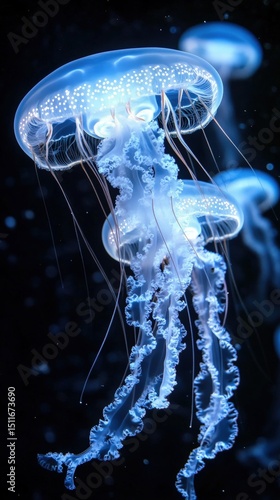 Ethereal jellyfish gracefully swimming in deep ocean waters at night