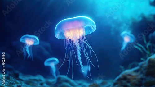 jellyfish, underwater, ocean, blue, aglow, glowing, aquatic, marin, tentacle, nature, sea, surreal, vibrant, aethereal, environment, calm, tranquil, wildlife, underwater photography, marine animal, illumination, peaceful, colourful, deep sea, ocean life, fluid, delicate, mysterious, wave, ecosystem, habitat, swimming, exploration, tranquil scene, beauty, natural, flowing, marine life, serene, blue light, organic