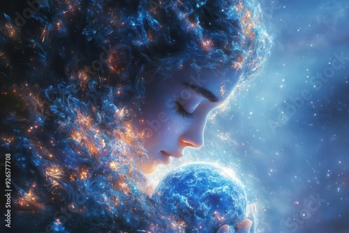 ethereal mother nature cradling newborn earth starry cosmic background flowing organic forms serene expression glowing aura