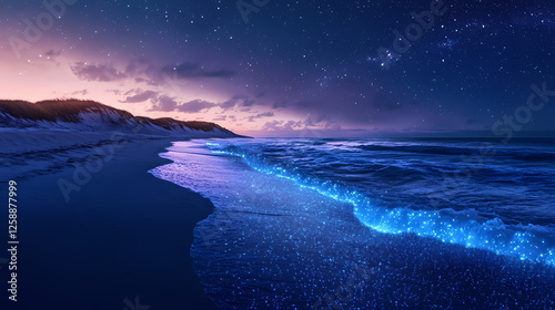 Ethereal ocean waves glowing with electric blue bioluminescence under starlit sky, creating natural light show along shoreline. Starlit Bioluminescence. Illustration
