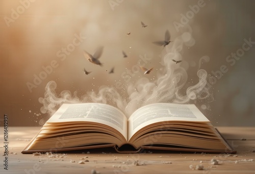 Ethereal Open Book Flying Birds Wisps Smoke Soft Warm Background - Magical Fantasy Personal Growth Book Cover Design, Inspiring Imagination Renewal