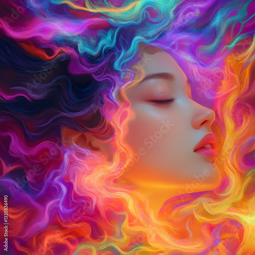 Ethereal portrait of a woman surrounded by colorful swirls dreamlike setting digital artwork abstract concept