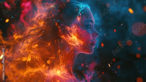 woman, fire, portrait, aethereal, light, sparkle, glow, energy, profile, fantasy, abstract, surreal, conceptual, beauty, artistic, creative, female, dream, cosmic, vibrant, colourful, mystical, magic, flames, imagination, illustration, digital, rendering, goddess, phoenix, spirit, light, warm, bright, texture, smoke, expression, face, passion, strength, transformation, power, divine, human