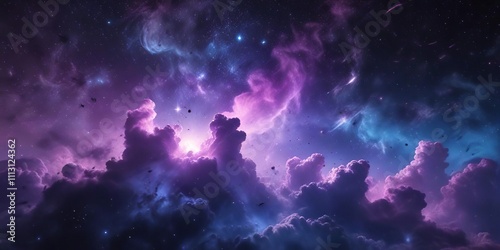 Ethereal purple clouds floating in a deep blue nebula galaxy background with stars , purple, cosmic