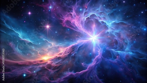 Ethereal scene of a nebula with tendrils of purple and pink gas, illuminated by a bright blue star, set against a dark canvas, space environment, gaseous nebula, cosmos