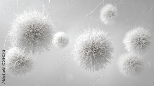 Ethereal White Fluffy Spheres Floating in a Dreamy, Softly Lit Space.