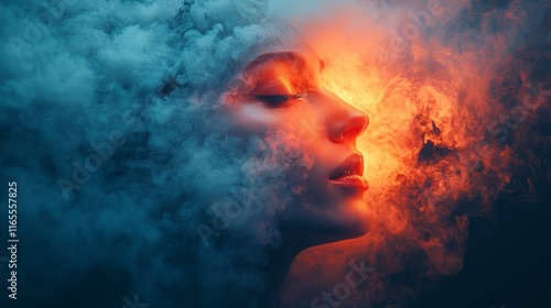 Ethereal woman surrounded by blue smoke and fiery hues