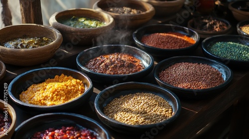 Ethiopian injera with colorful stews lentils and spices in shared communal setup