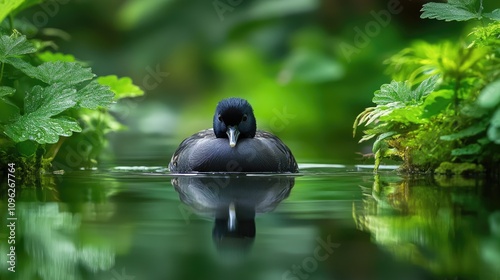 Eurasian Coot swimming peacefully in a tranquil pond, surrounded by vibrant green foliage, showcasing its reflection during the breeding season.