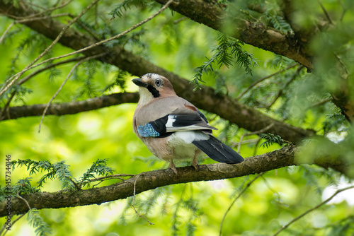 Eurasian Jay (Garrulus glandarius) perched on a tree branch in Zurich, Switzerland