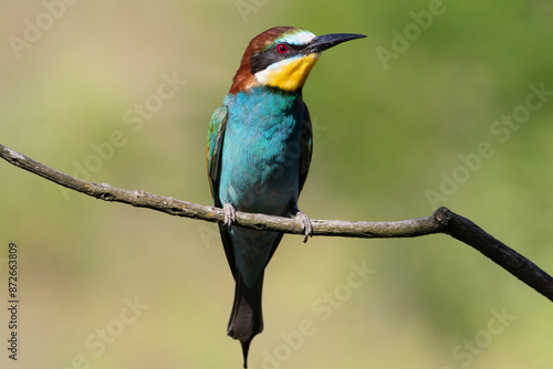 European bee-eater, merops apiaster. A bird sits on a branch on a smooth background