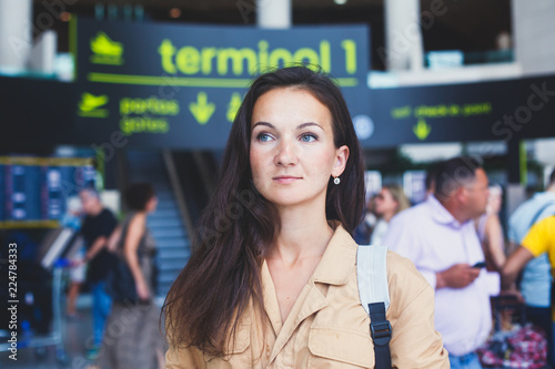 European brunette young girl standing in the airport terminal hall waiting for boarding