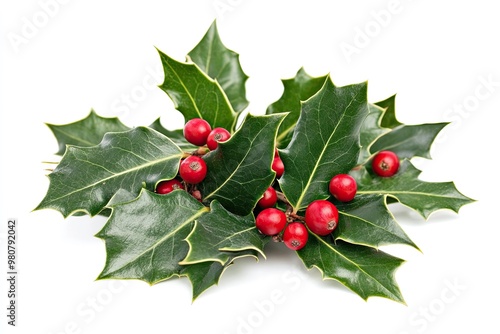 European Holly (Ilex aquifolium) leaves and fruit isolated on white