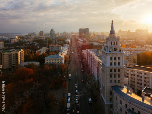 Evening autumn Voronezh, aerial view. Tower of management of south-east railway and Revolution prospect