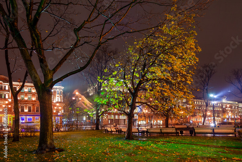 Evening city square during the rain. Tree with colorful yellow foliage and fallen leaves on the lawn. Rainy autumn weather. Catherine Garden, Historical Center of St. Petersburg, Russia. Night city.