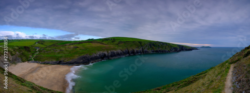 Evening light on the Ceredigion cliffs and Cardigan Island from Mwnt, Wales