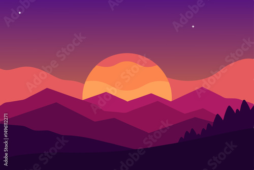 Evening Sun Golden Hour Over Valley Wallpaper Vector Illustration Background