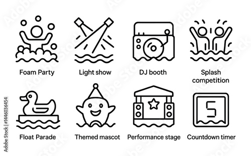 celebration, event, party, festival, outline, linear, vector, icon, set, entertainment, festivity, show, design, theme, music, dance, fun, decoration, performance, light, parade, stage, timer, countdown, booth, mascot