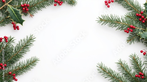christmas, holiday, evergreen, holly, frame, festive, winter, berry, decoration, tree branch, white, seasonal, ornament, celebration, december, nature, plant, background, border, design, red, green, traditional, new year, greeting, card, template, arrangement, isolated, copy space, botanical, twig, foliage, conifer, pine, spruce, fir, elegant, simple, minimalist, fresh, style, object, detail, still life, artistic