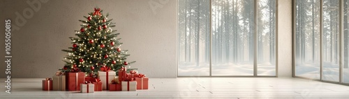 Evergreen Christmas tree surrounded by wrapped gifts, festive holiday ambiance, flat design illustration