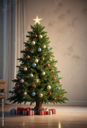 Evergreen Christmas tree with star-shaped ornaments, glowing lights, holiday decoration, evergreen christmas tree