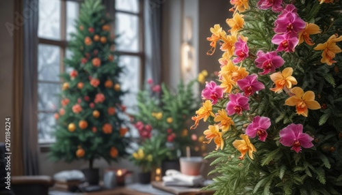 Evergreen fir tree with vibrant orange yellow pink and red orchid decorations, nature-inspired decor, eco friendly ornaments, floral wreaths