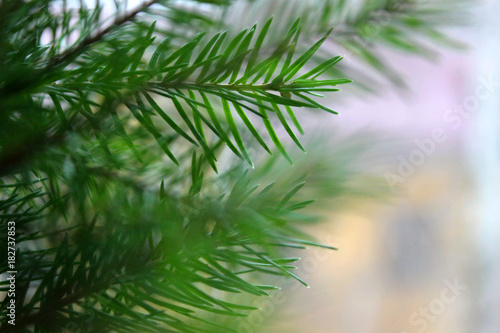 Evergreen tree branches closeup.Christmas tree frame