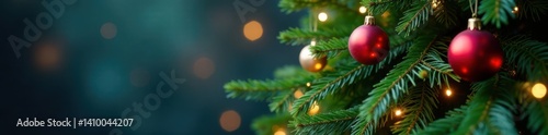 Evergreen tree with colorful ornaments and twinkling lights , holiday decor, decorations, baubles