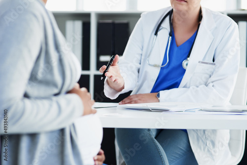 Everything looks good.... Cropped shot of an unrecognizable female doctor consulting with a pregnant patient at a hospital during the day.