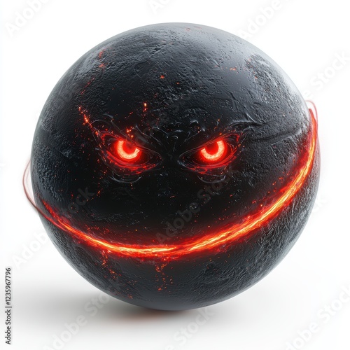 Evil-looking black hole planet with glowing red eyes and a swirling dark aura, isolated on a clean white background