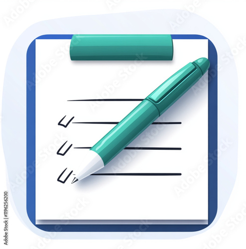 exam paper with pen,background is white,pen is green,paper is system blue,paper write a flow line with black on the paper
