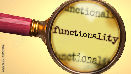 Examine and study functionality, showed as a magnify glass and word functionality to symbolize process of analyzing, exploring, learning and taking a closer look at functionality, 3d illustration