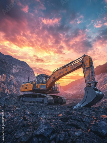 Excavator operating at sunrise in a rugged mountainous mining landscape. The massive machinery stands amidst dramatic cliffs rocks and a stunning sky backdrop with dramatic clouds and vibrant colors