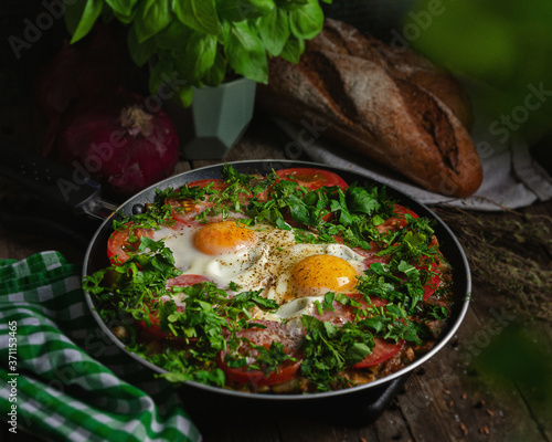 breakfast, table, traditional, vegetable, lunch, food, vegetarian, meal, pan, healthy, parsley, tomatoes, egg, fried, pepper, delicious, sauce, dish, bread, dinner, egg, background, red, epicure, cookery, poached, cooked, cooking, eat, tasty, herb, brunch, spice, homemade, fresh, herb, green, rustic, wooden