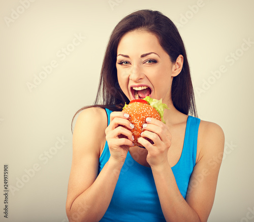 Excited happy hungry woman wanting to bite tasty burger on blue background. Closeup