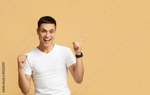 excited, happy, student, happiness, celebrate, greatest, triumph, victory, fist, believe, success, young, winning, man, isolated, beige, background, free space, studio shot, technology, expression, good, luck, business, teenage, white, t-shirt, joy, succeed, fun, impressive, successful, work, joyful, emotion, enjoy, offer, cut-out, quarantine, advertisement, banner