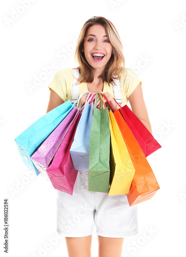 Excited young woman with shopping bags on white background