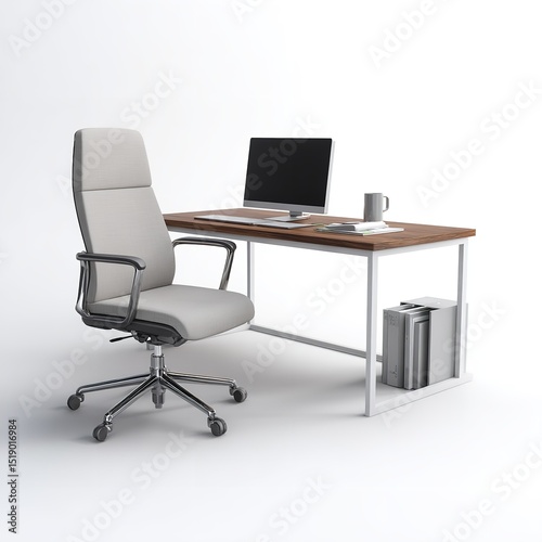 chair, desk, office, computer, furniture, workstation, design, style, executive, home, setup, monitor, keyboard, mouse, mug, book, white, wood, metal, modern, workspace, interior, ergonomic, comfortable, seat, table, minimalist, contemporary, chrome, rolling, study, indoor, empty, desktop
