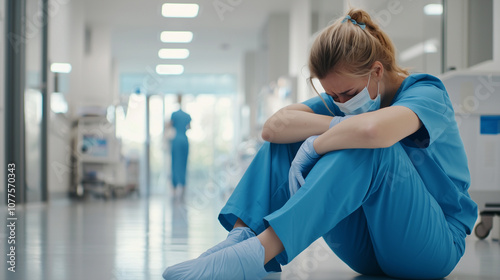 Exhausted healthcare worker in blue scrubs sitting on hospital floor