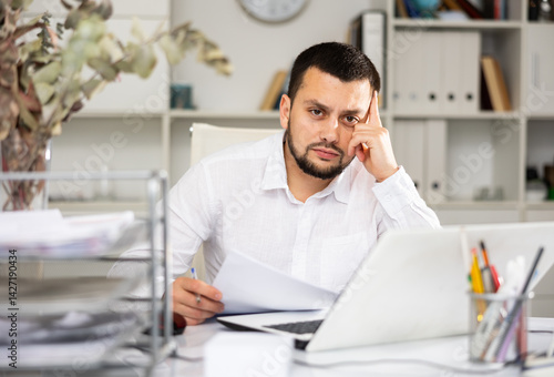 office, secretary, man, accountant, documentation, businessman, bookkeeper, sad, exhausted, sleepy, european, caucasian, french, german, american, 30s, laptop, professional, male, desk, working, computer, paper, entrepreneur, corporate, indoor, occupation, modern, finance, job, workplace, manager, desktop, report, workspace, professional occupation, office worker, strategy, specialist, office, table, emotional, employer