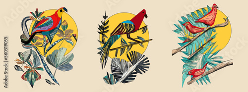 Exotic bird on tree branch with leaves and sun on light beige background. Colorful illustration.