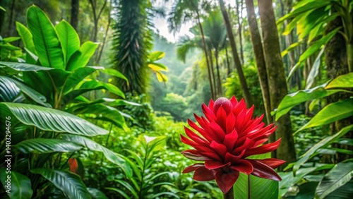 Exotic vibrant red flower blooms in the midst of dense lush green foliage amidst a tropical jungle landscape with towering trees and vines surrounding it, greenery, plant life