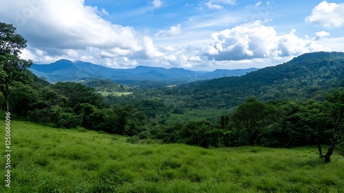 Expansive lush green valley with distant mountains under a bright blue sky scattered with fluffy clouds : Generative AI