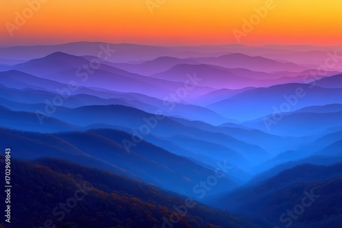 Expansive mountain landscape transitions from twilight to dawn showcasing a stunning gradient of purple, blue, and orange hues evoking a sense of tranquility and natural beauty reflecting on