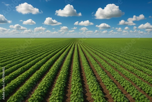 soybean, farm, agricultural, field, blue, sky, background, expansive, organic, plantation, stretching, horizon, healthy, green, crop, bright, sustainable, agriculture, breathtaking, aerial, view, huge, farmland, organised, row, mature, plant, creating, geometric, pattern, landscape, fluffy, white, cloud, scattered, up high, fertile, dirtied